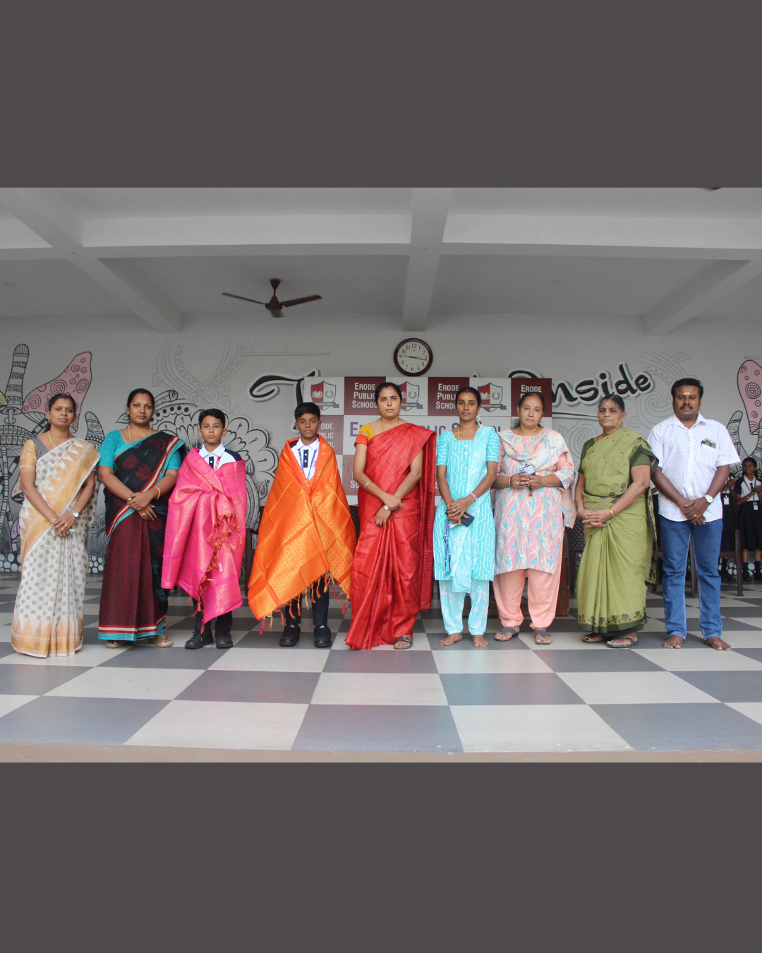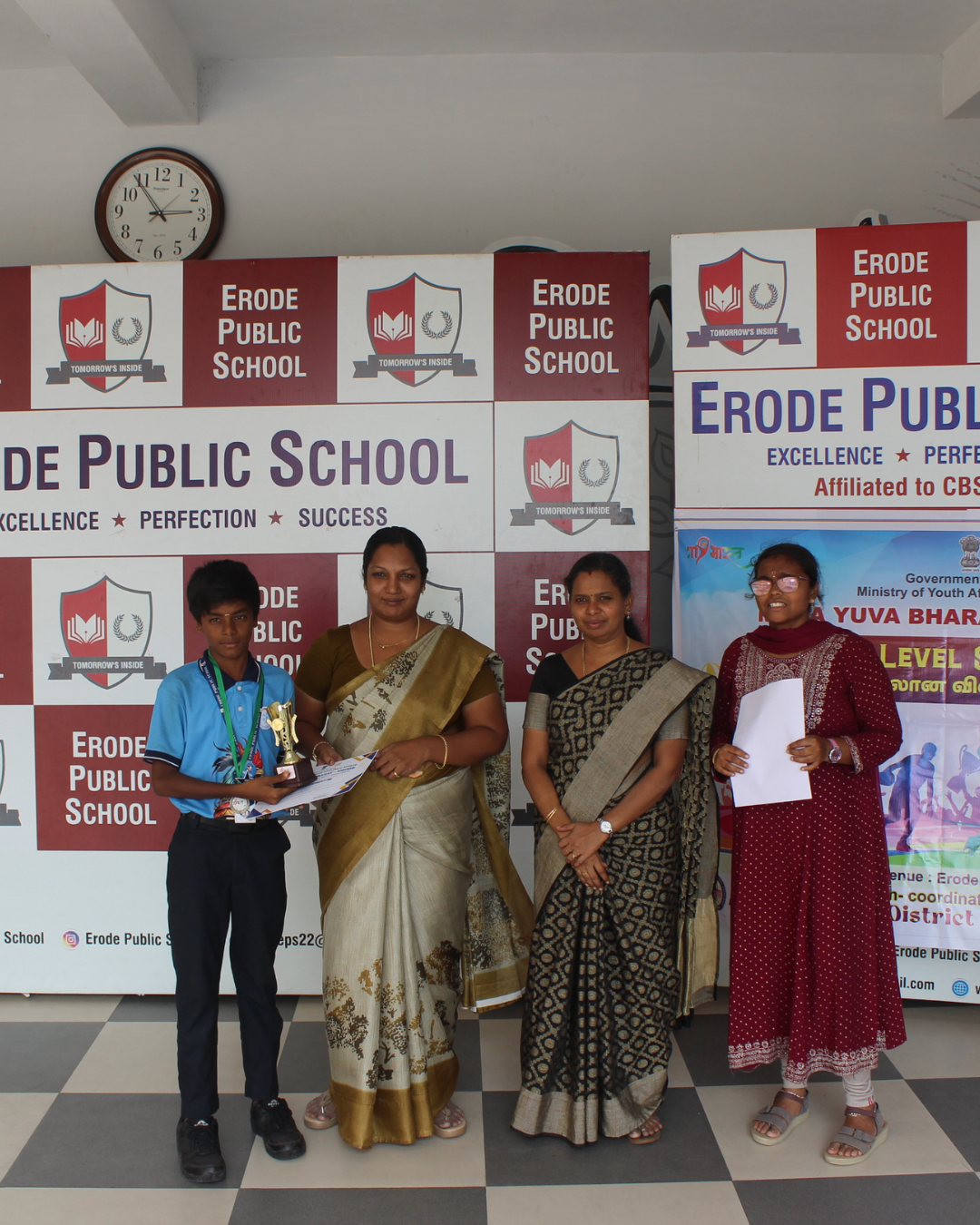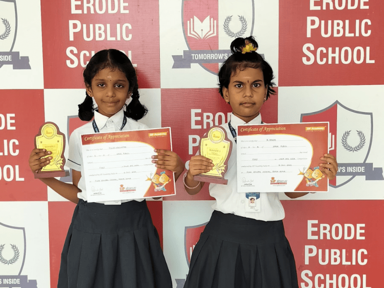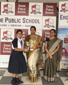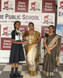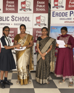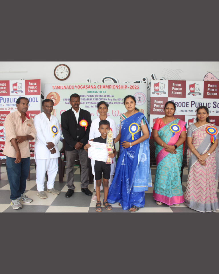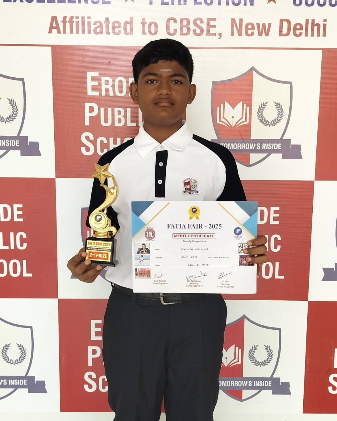 Mera Yuva Bharat, Erode - Under the Government of IndiaMinistry of Youth Affairs & Sports. Sarvesh. M U-15 Boys 1st Place in Silambam Sanmathi K.V U-15 Girls Running 1st Place Kanishkasri J Girls 1st Place in Silambam Samrutha A U-15 Girls Silambam 2nd Place Dharshana U-15 Girls Running 2nd Place Sidharth L.M – U-15 Boys Running 2nd Place Nitheesan S.N U-15 Boys Silambam 2nd Place Sasmitha M.R – U-15 Girls Running 3rd Place Haridharasan. S U-15 Boys 3rd Place in Silambam Kanishka T U-15 Girls Silambam 3rd Place Other Winners & Achievements Dharshan V – Won 1st Place in English Essay Writing Competition at Techno Cultural Fest (Kongu Engineering College)) P.S Sai Nakshatra & K. Kanya – Winners of Color & Click Competition (SIP ACADEMY) Champions of Karate 2025 (National, State & District) Kapilan R & Nitheesan S.N – Winners of 2nd South Indian Invitational open Karate Championship 2025 S Asvath Adithiyaa – 2nd Place in Kata Competition (FATIA FAIR 2025)) Kapilan R & Nitheesan S.N – Winners of 3rd Open National Karate Championship Meeting the Trustee of Erode Public School Honouring the Parents of National Karate Winners Kapilan R – Champion of 28th All India Shitoryu Karate-Do Championship Receiving the Champions at Erode Railway Station Champions of TamilNadu Yogasana Competiton Erode Sahodaya Association Competitions Mozhiyarasi R.K – Second Place in Under 7 Tennis Ball Throw U-14 Boys ESA Volley Ball Competiton – 3rd Place. Mahinthana S – Third Place in U-12 Shot Put Children's Day Quiz Competition by Federal Bank